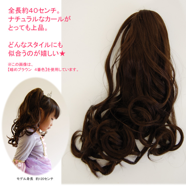 つけるだけで簡単にロングヘアに変身できちゃう子供用ウィッグです。 どんなスタイルにも似合って、お手軽にプリンセス気分が満喫できます☆ 使い方はカンタン! ポニーテールやシニョンなどのまとめた髪にクリップをはさむだけ。 ぶきっちょさんでも、あっという間にできちゃいます。 ☆サイズ☆ 全長約40cm ☆お色は2色☆ 自然な黒(2番色)・・・ほぼ黒に近いですが、よく見ると茶色がかったお色です。 暗めブラウン(4番色)・・・自然な髪色にも馴染みやすいダークブラウンです。 ※商品保護のためお届けの状態はネットに入っている場合がありますが、ご使用の際は外してください。 ※画像は実物のお色を再現できるようにしておりますが、 PCモニター環境の設定等により実物のイメージ(色・質感等)が 異なる場合もございますので予めご了承くださいませ。 『12aw』